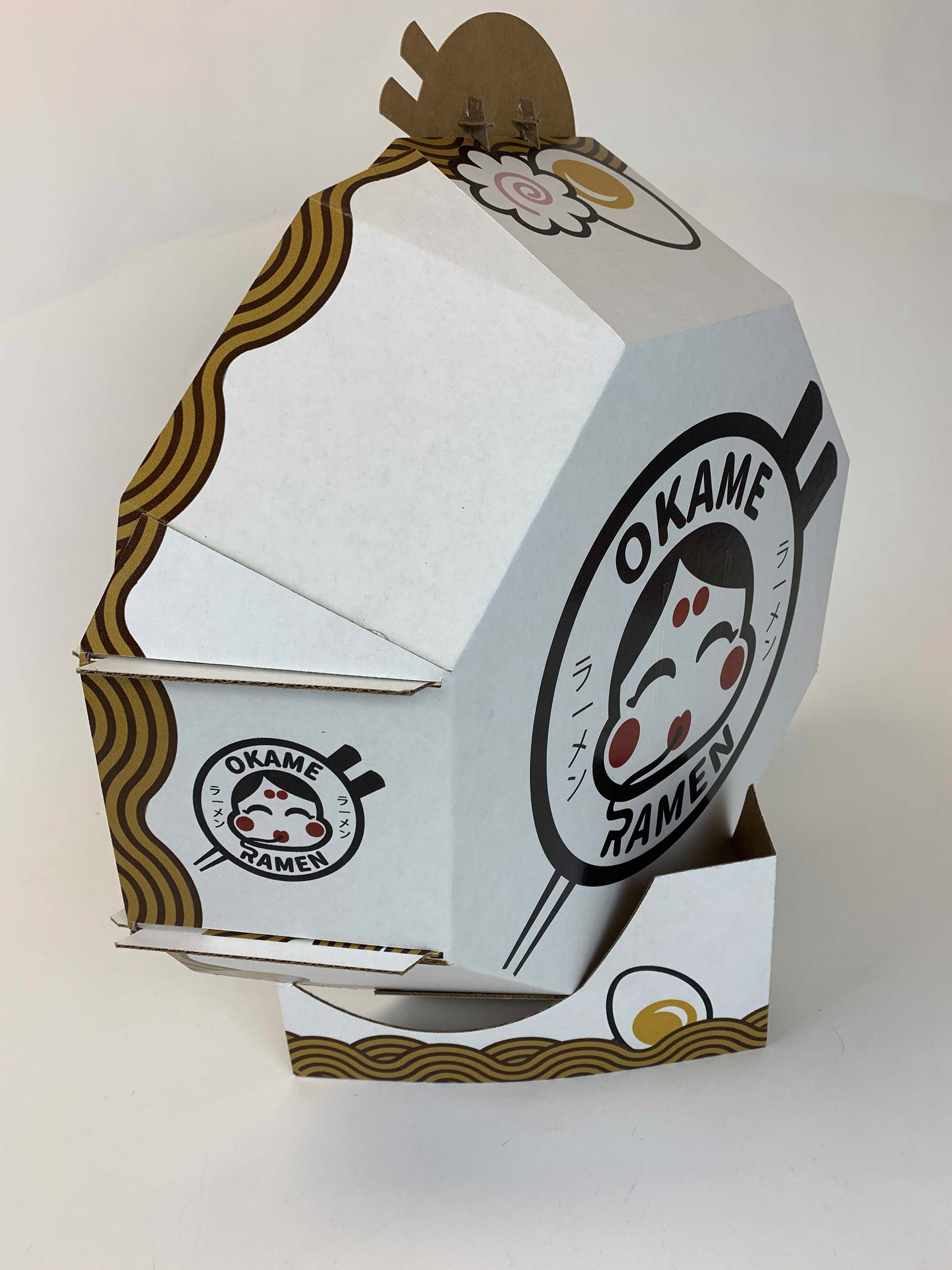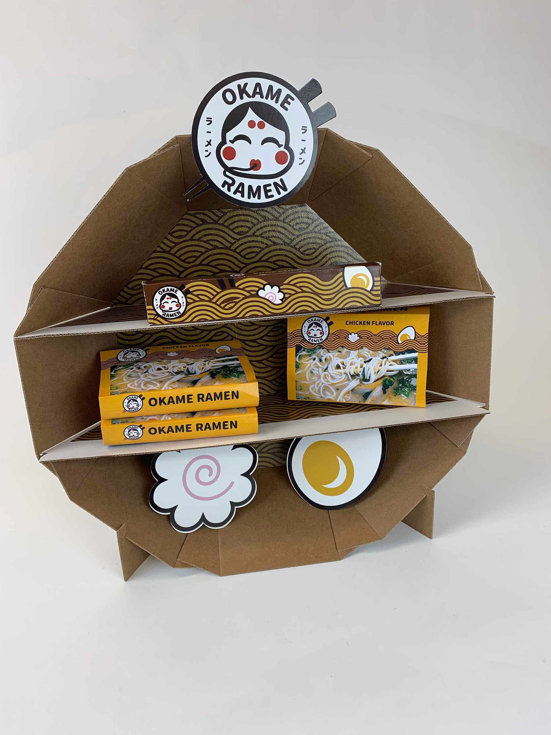 Okame Ramen is an instant ramen food line located in the United States. This display stand was made with the idea of easy assembly with a beautiful graphics and intricate cardboard design made to be displayed in stores.